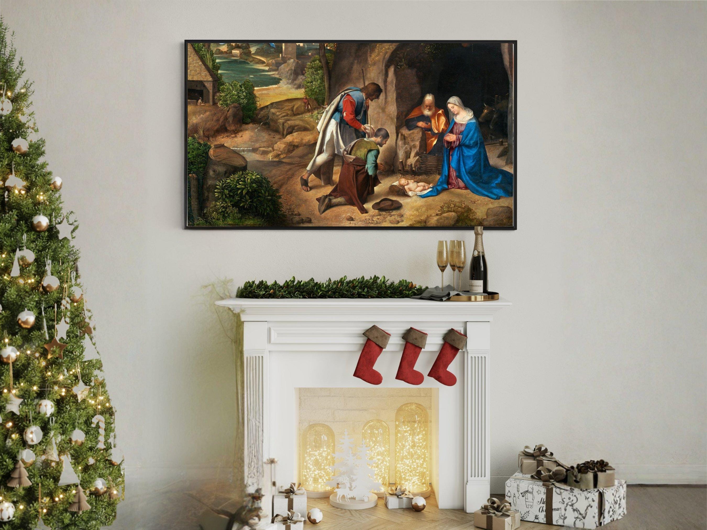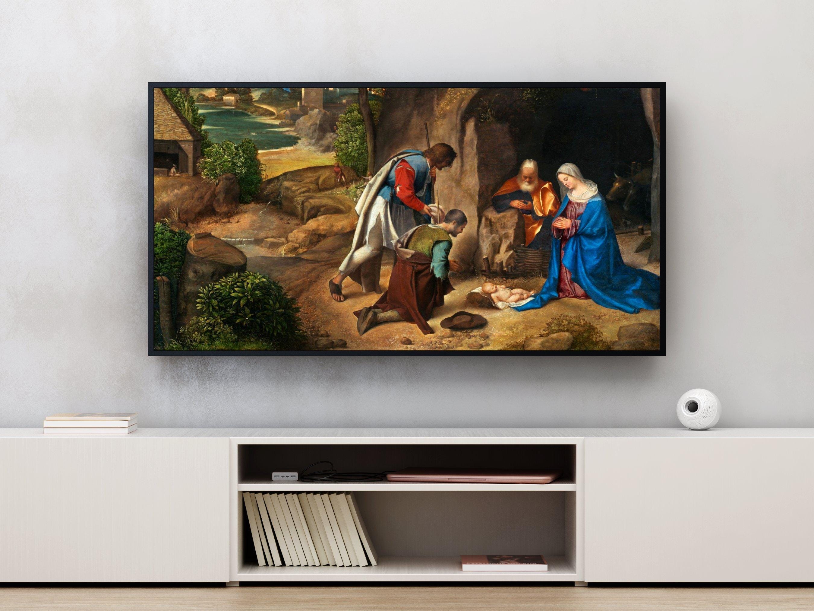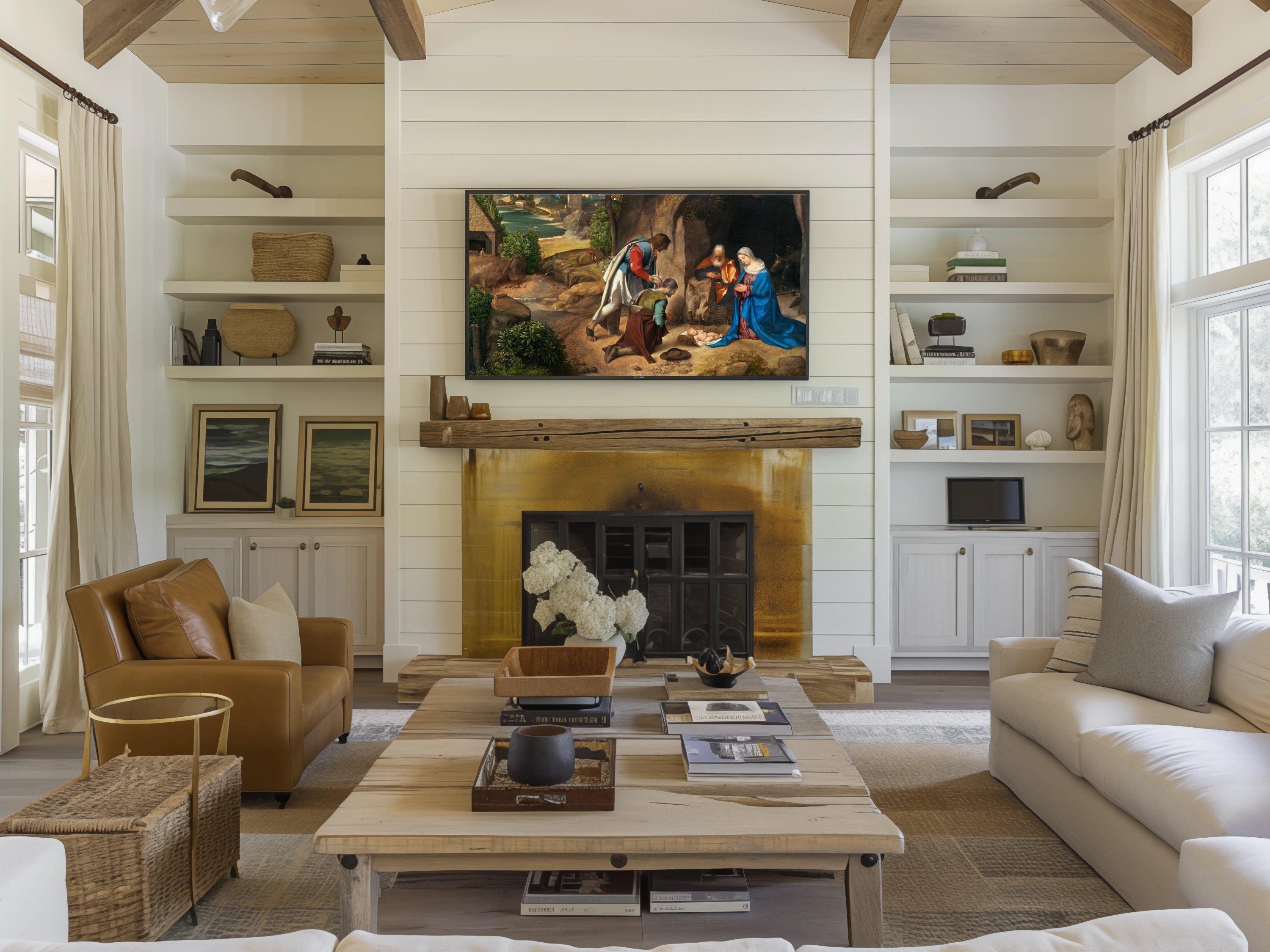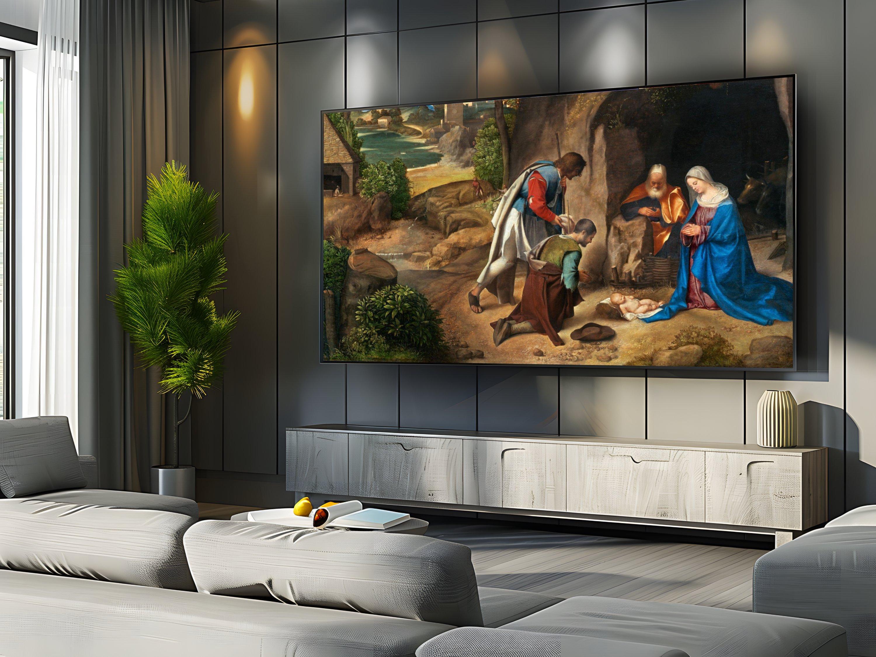 Discover the tranquil charm of this nativity screen art, beautifully capturing Mary and Joseph in a tender moment with baby Jesus. Rendered in warm tones artwork, this piece brings a peaceful glow to your Christmas screen art collection, perfect for enhancing any Frame TV display. Inspired by timeless holy family decor, it invites quiet reflection and reverence during the holiday season.