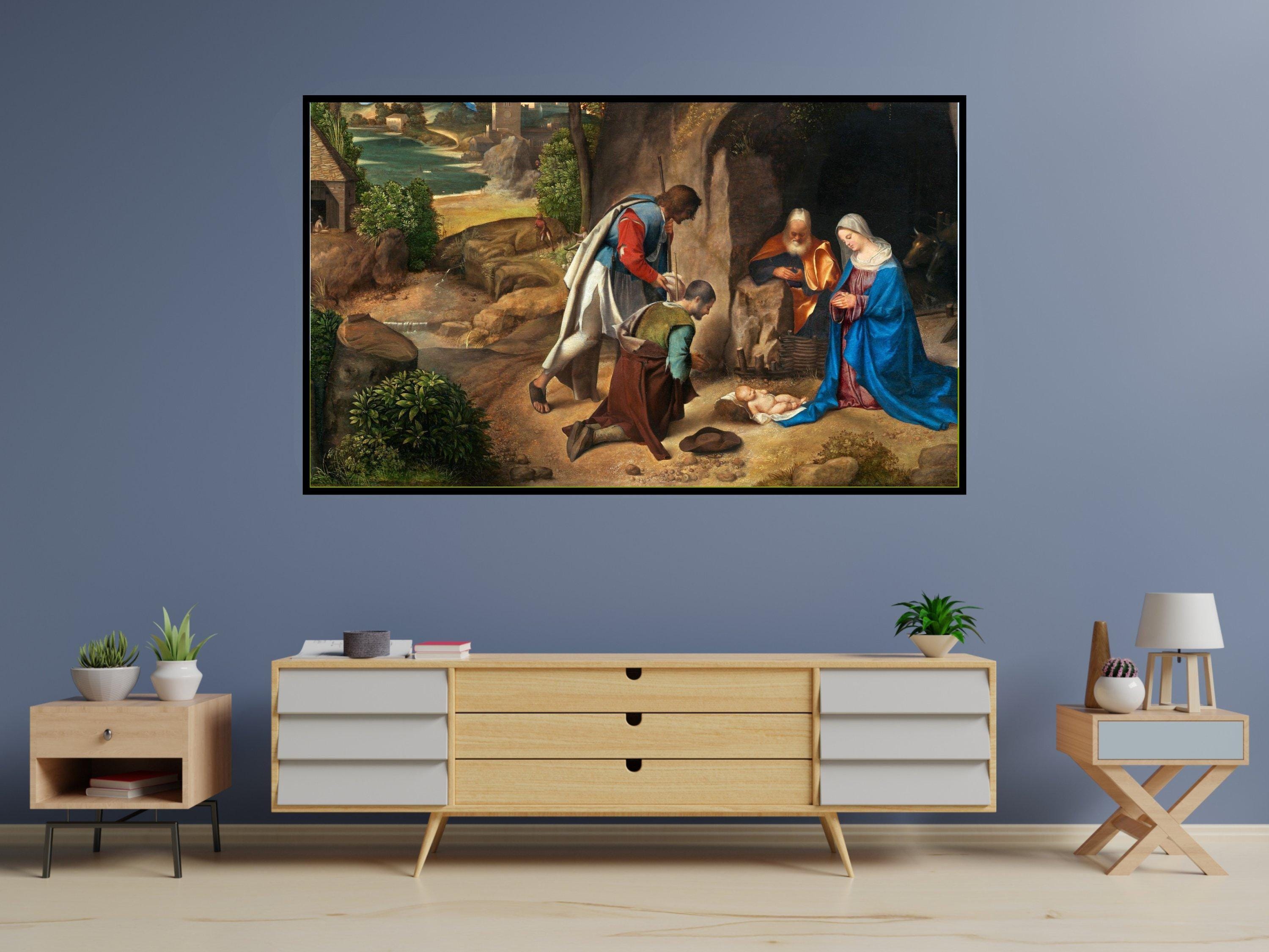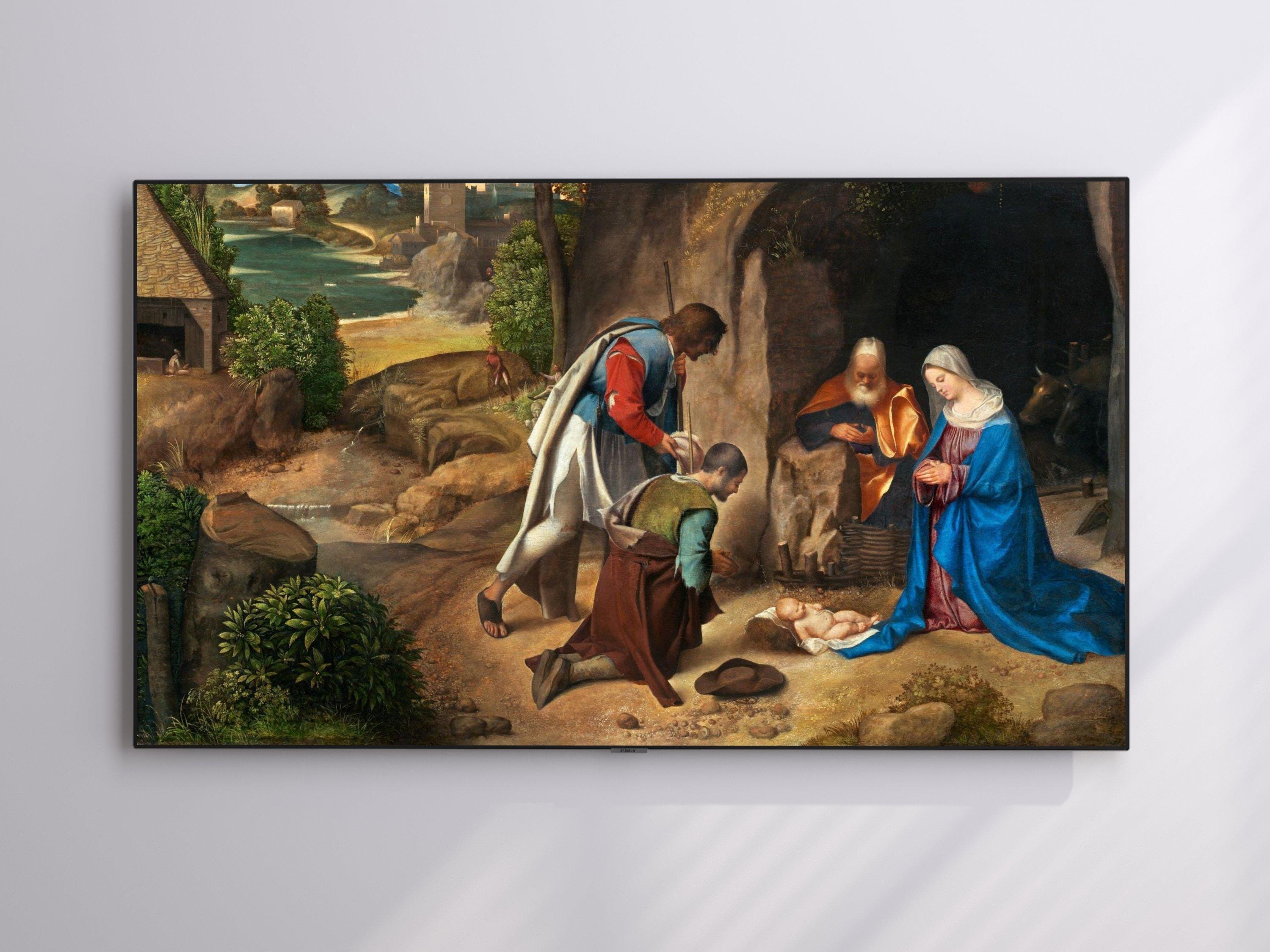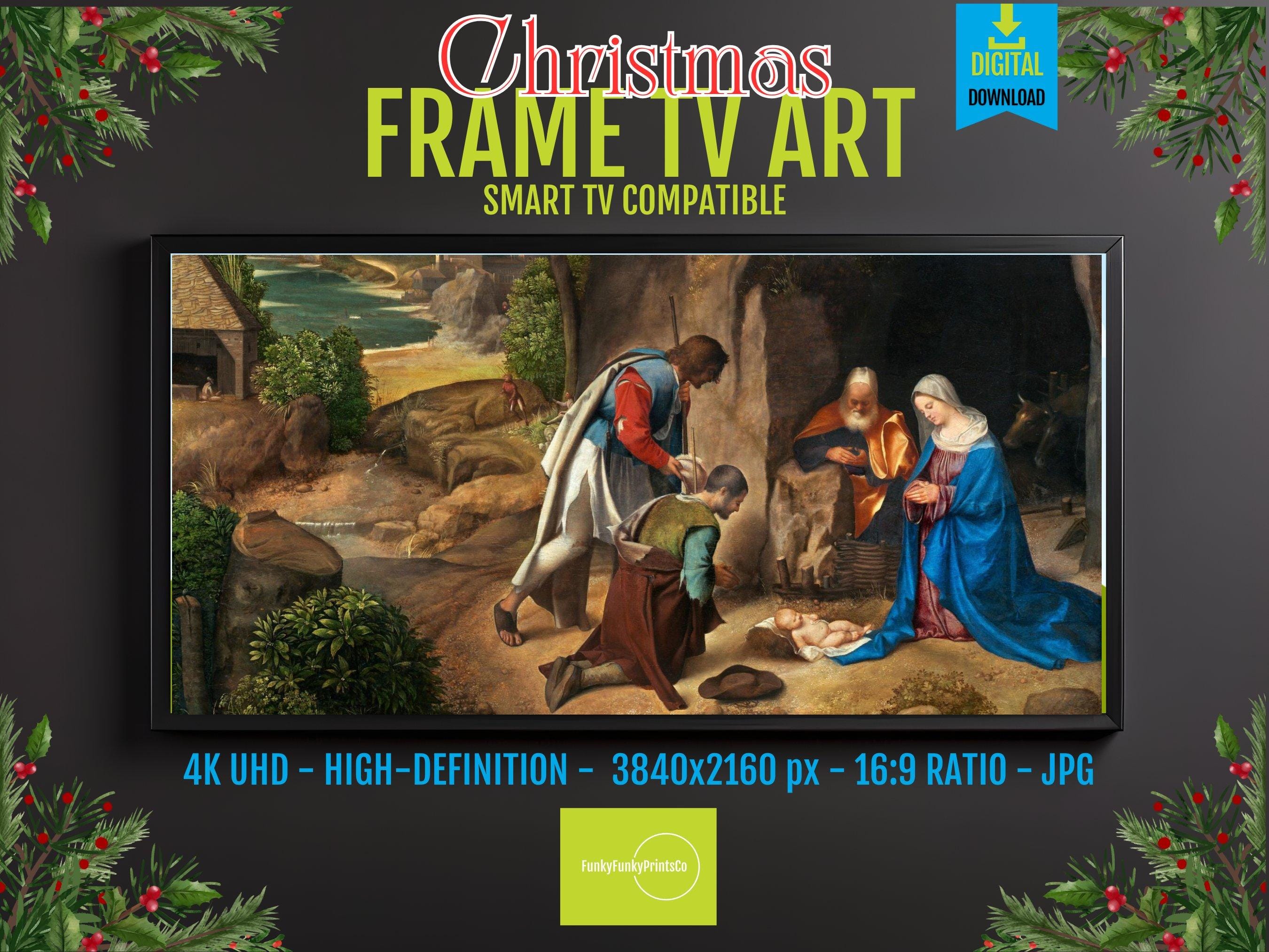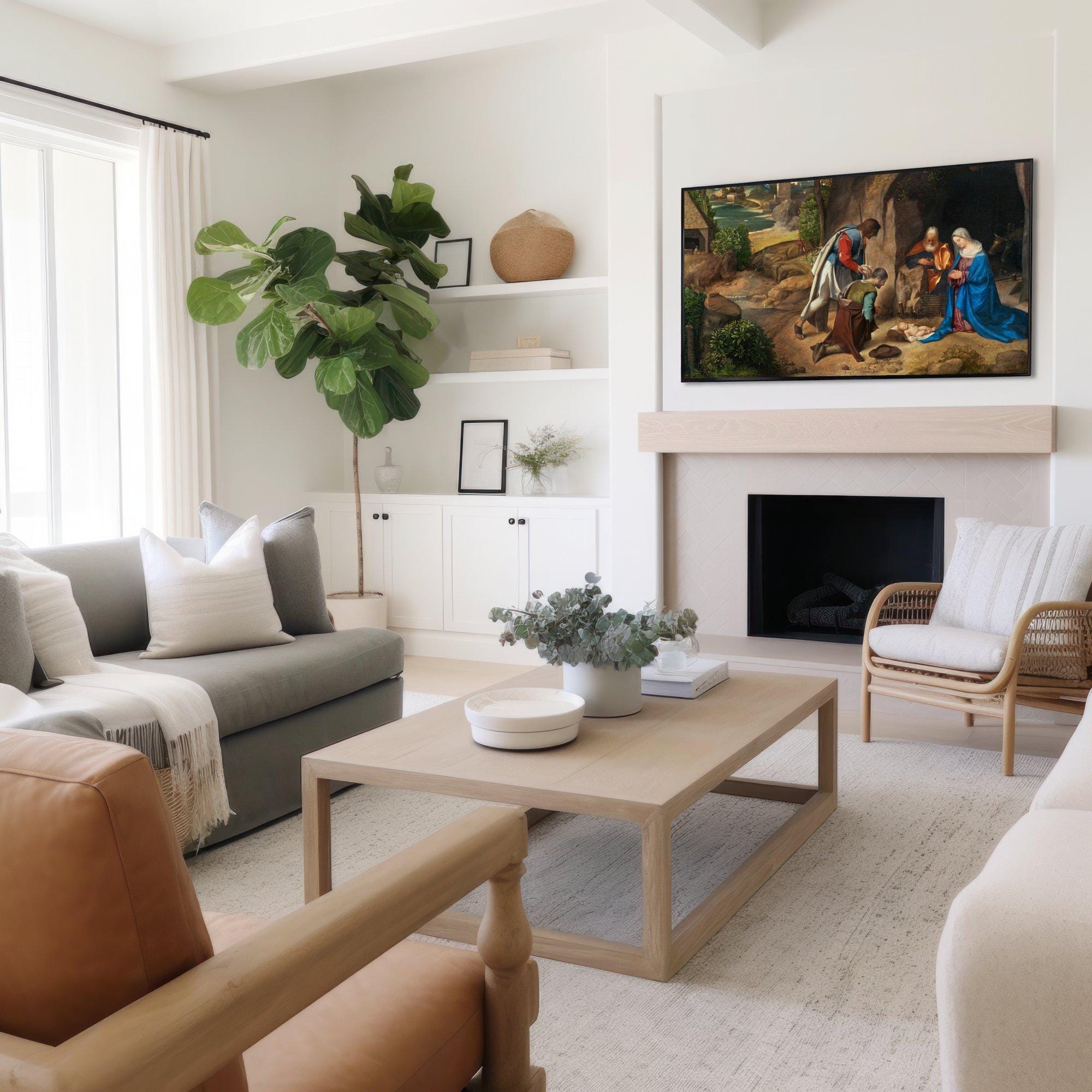 Discover the tranquil charm of this nativity screen art, beautifully capturing Mary and Joseph in a tender moment with baby Jesus. Rendered in warm tones artwork, this piece brings a peaceful glow to your Christmas screen art collection, perfect for enhancing any Frame TV display. Inspired by timeless holy family decor, it invites quiet reflection and reverence during the holiday season.
