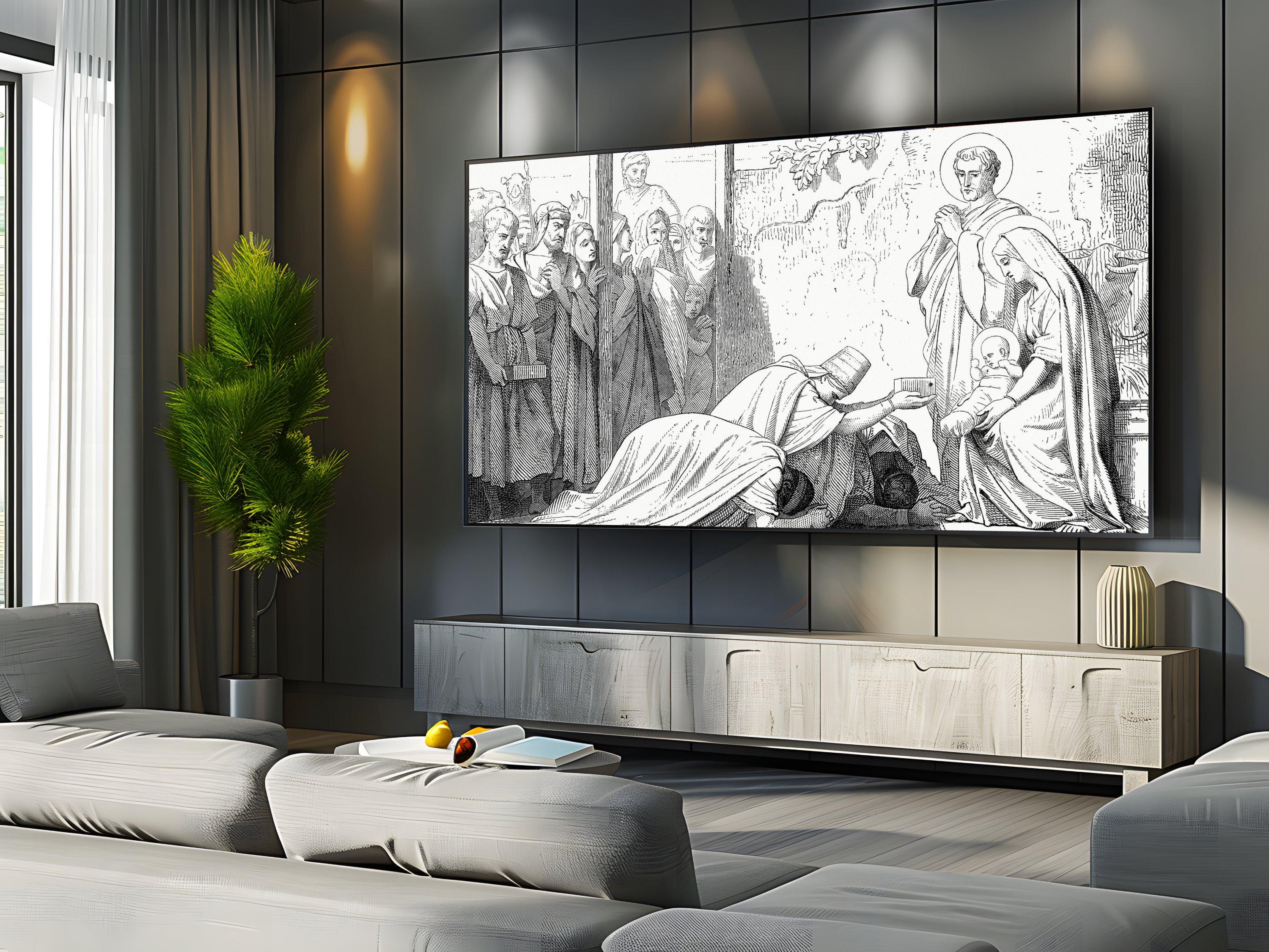 Experience a serene moment captured in this nativity line art, where every delicate stroke brings a sacred biblical scene to life. This monochrome religious wall art is thoughtfully designed as digital screen decor, perfect for adding spiritual grace to your Frame TV or any digital device. Crafted with intricate engraving-style details, this instant download art invites quiet reflection and reverence.