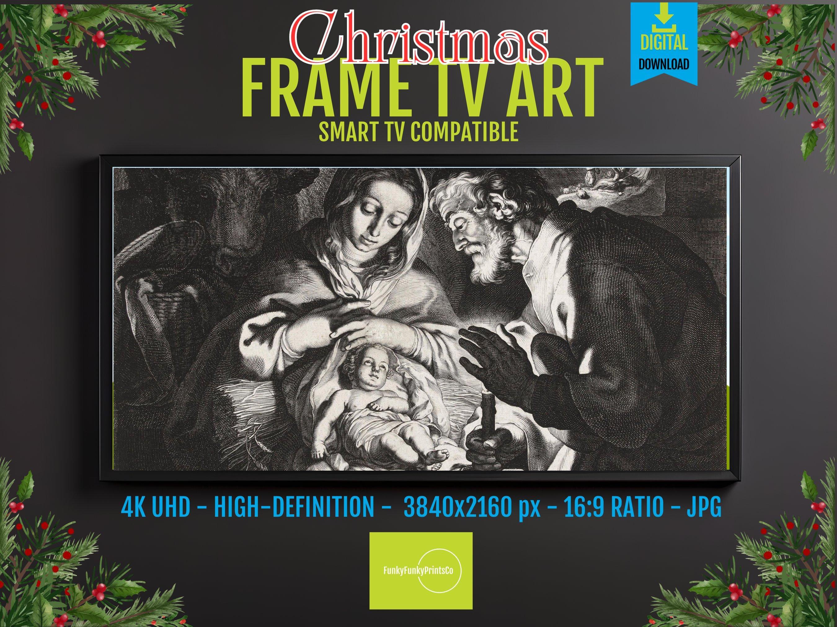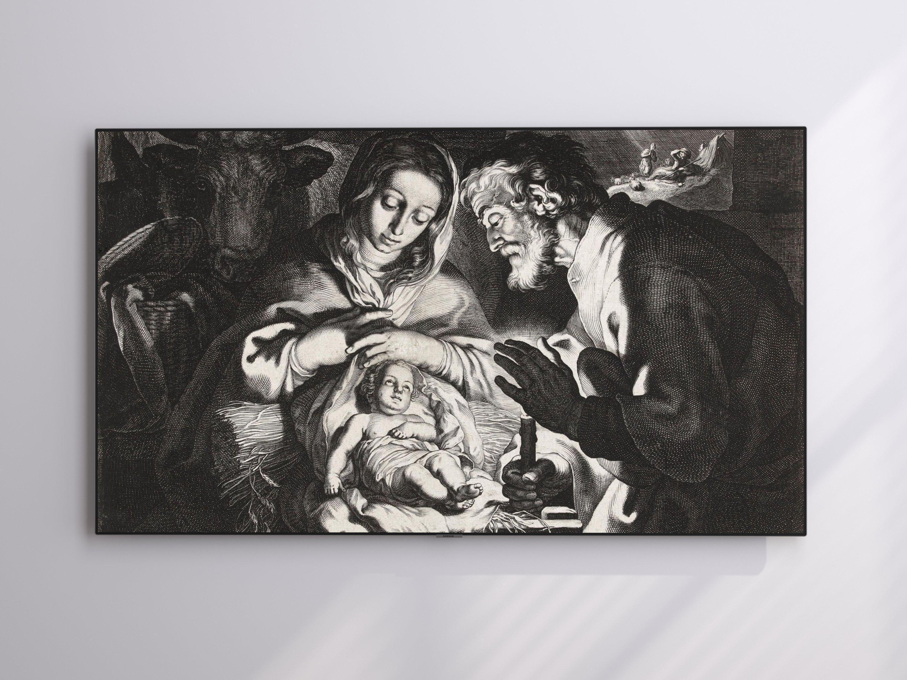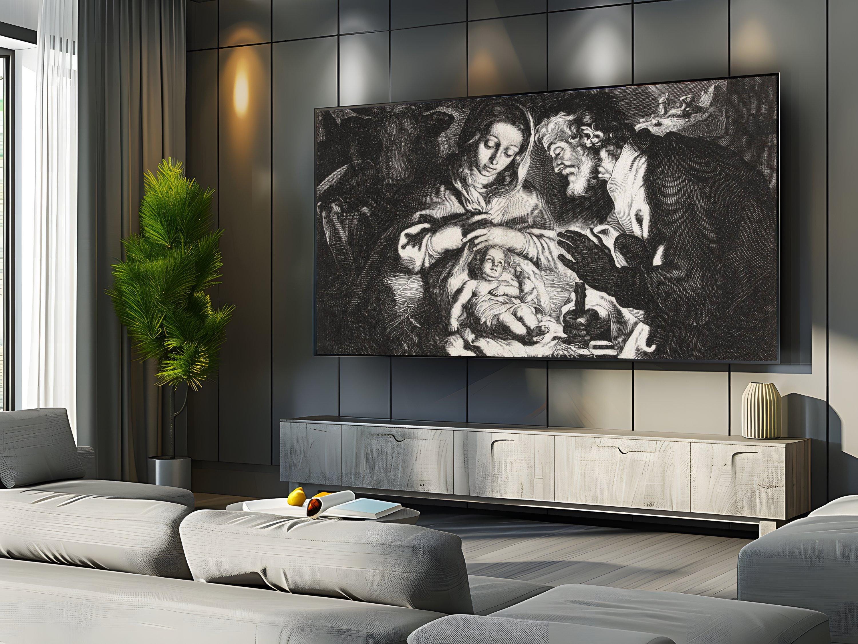 Immerse yourself in the tranquil beauty of this Nativity scene digital art, where the tender gaze of Mary and the reverent pose of Joseph come alive in a sacred holiday decor piece. Designed specifically for Samsung Frame decor, this artwork blends faith-inspired print traditions with the convenience of a digital download art file. Curated and enhanced with AI refinement, it offers a serene Mary portrait that enriches any spiritual wall art collection.