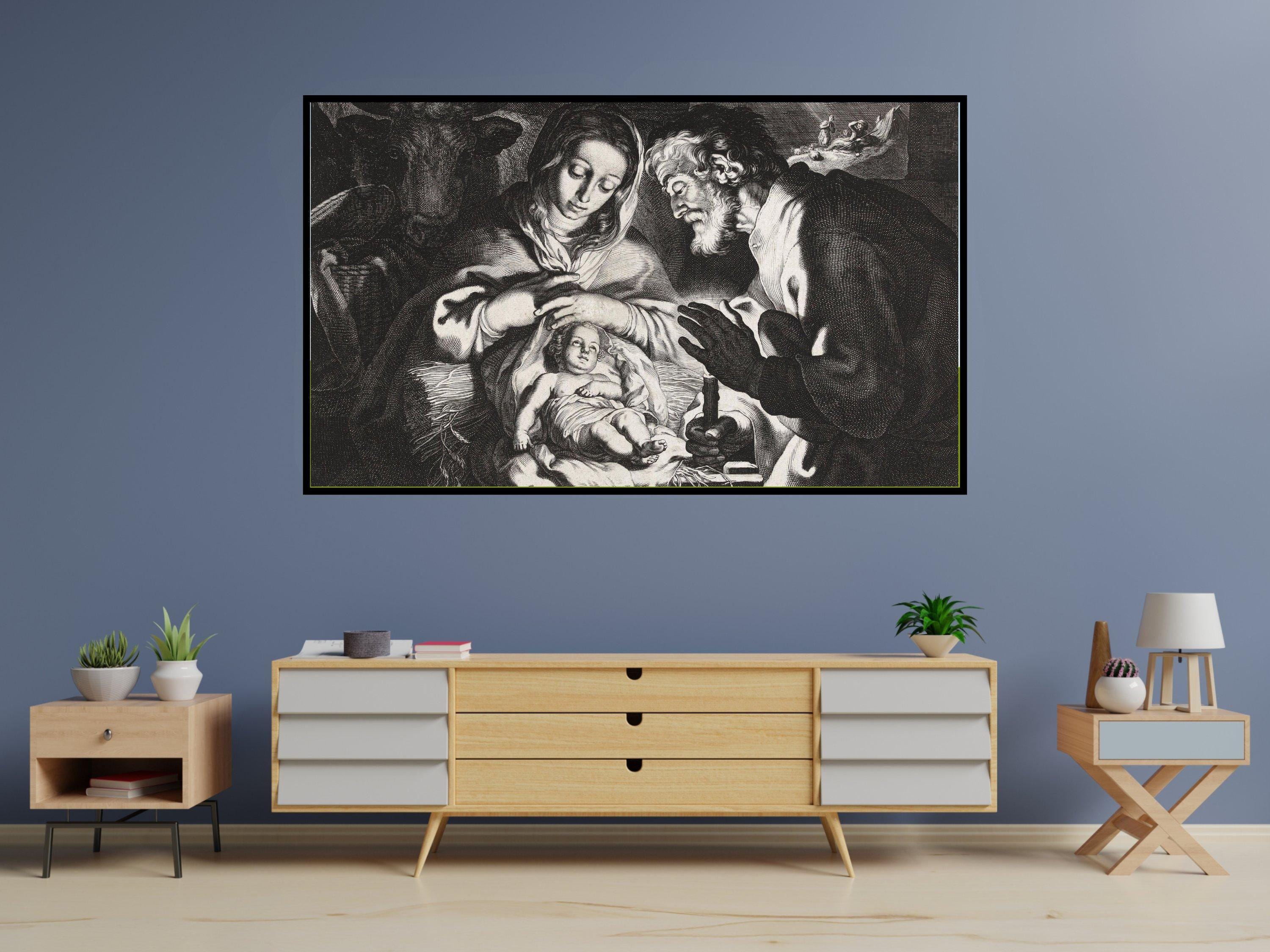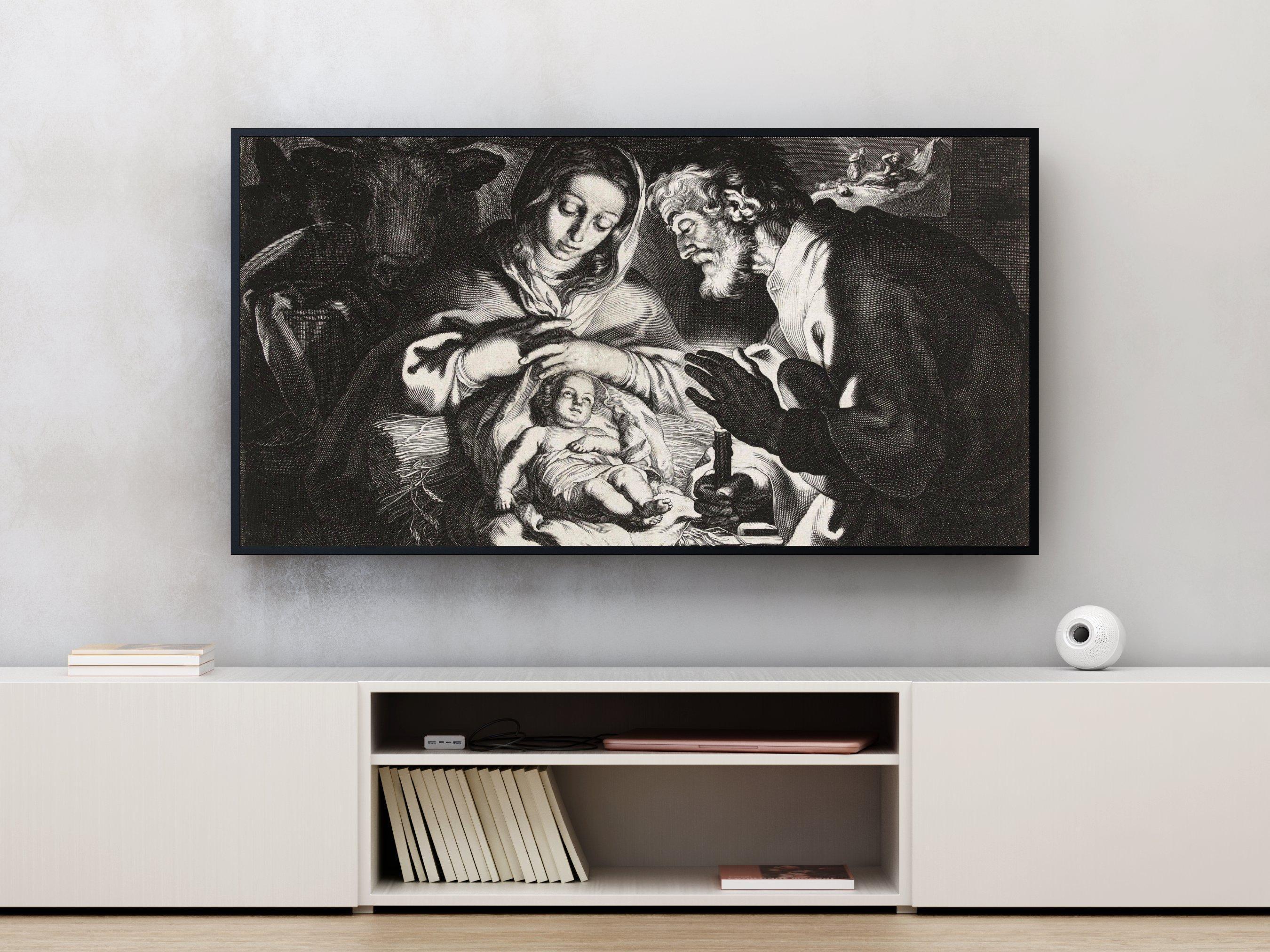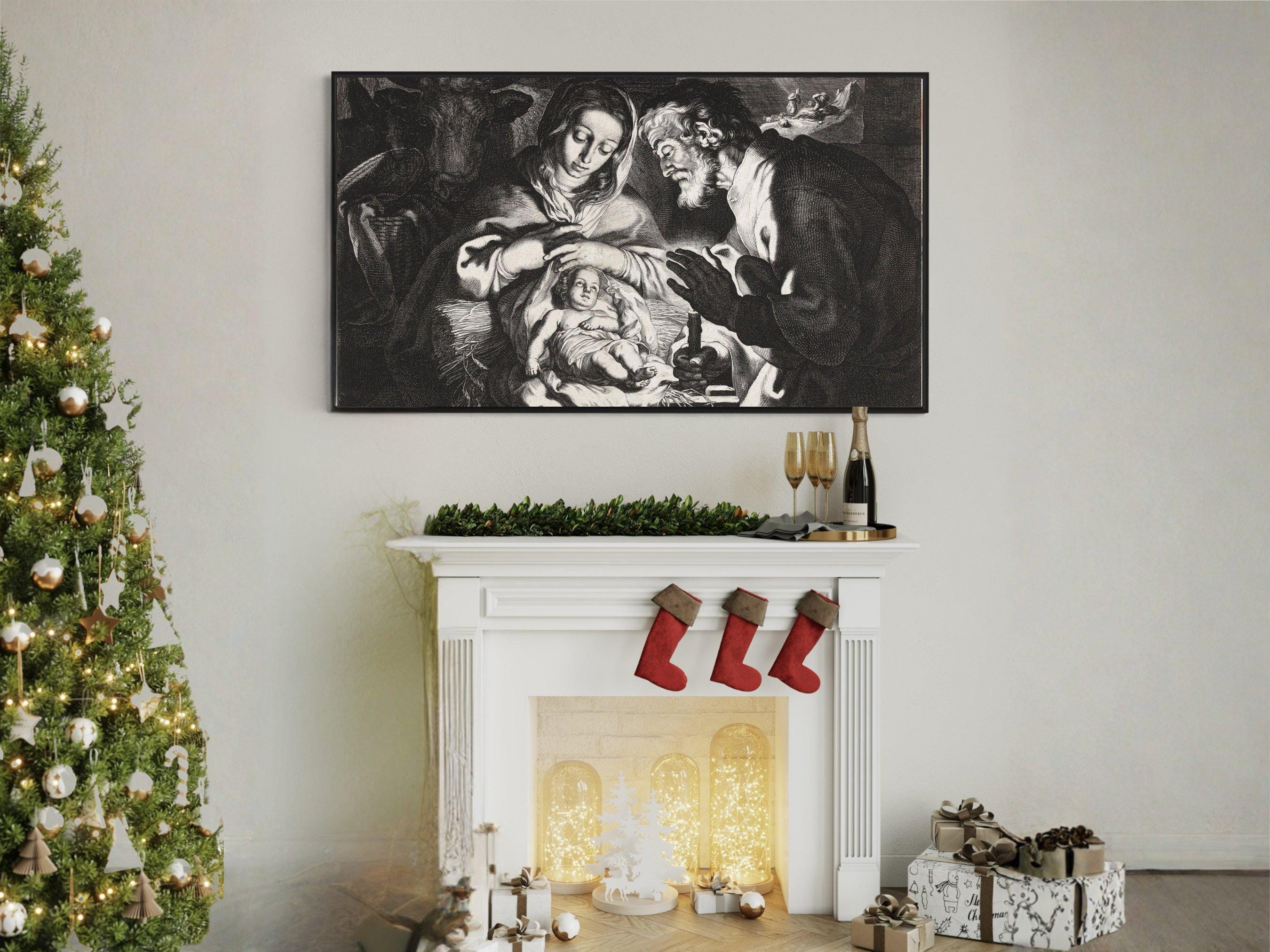 Immerse yourself in the tranquil beauty of this Nativity scene digital art, where the tender gaze of Mary and the reverent pose of Joseph come alive in a sacred holiday decor piece. Designed specifically for Samsung Frame decor, this artwork blends faith-inspired print traditions with the convenience of a digital download art file. Curated and enhanced with AI refinement, it offers a serene Mary portrait that enriches any spiritual wall art collection.