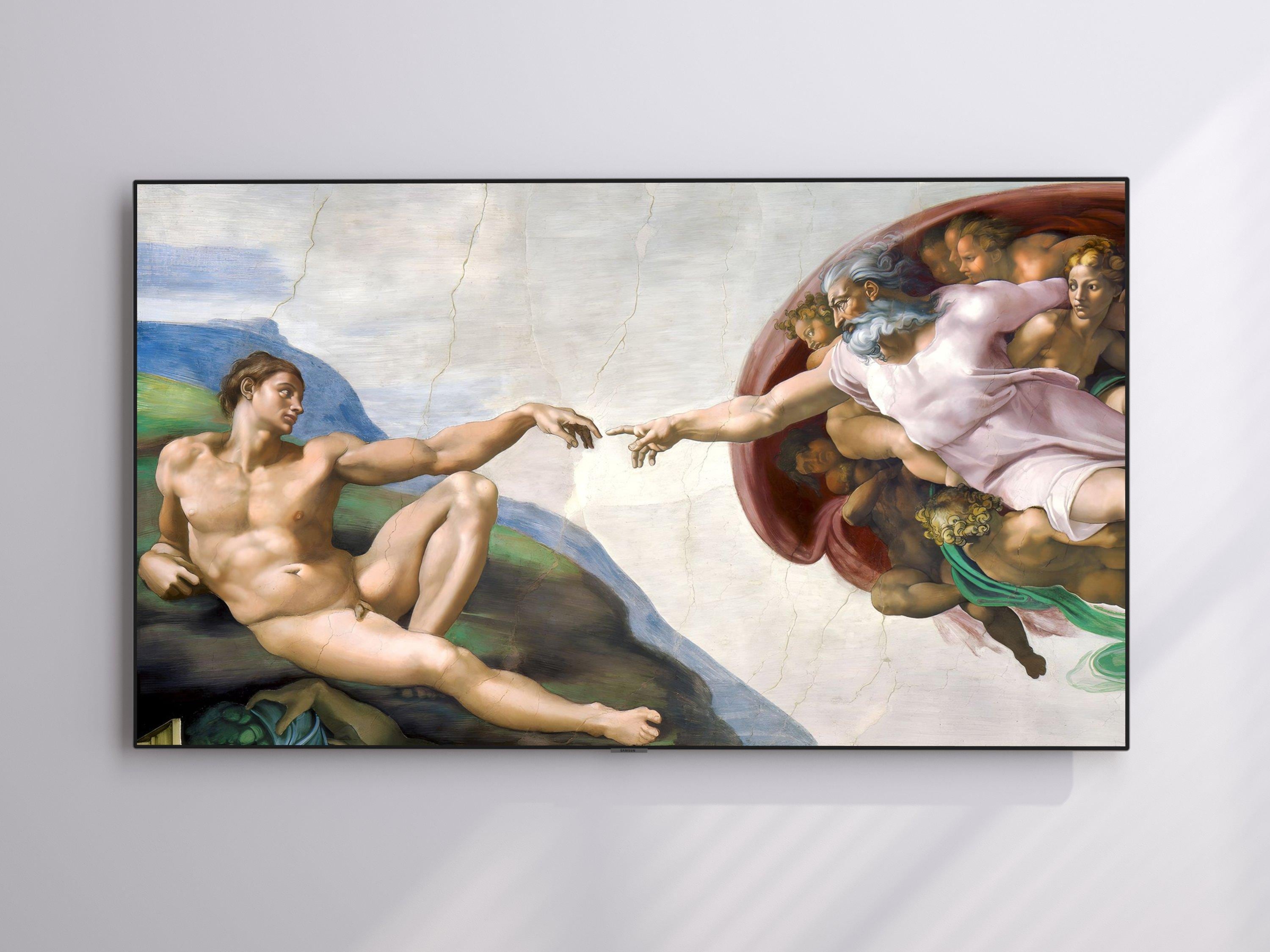 Immerse yourself in the divine beauty of this digital art inspired by the Creation of Adam, a masterpiece that captures the sacred moment between God and Adam beneath an ethereal blue sky. This vibrant screen art brings a fresh perspective to classic Michelangelo art, designed specifically for your digital home display. Perfect for those seeking spiritual wall decor that combines timeless artistry with modern 4K UHD clarity.
