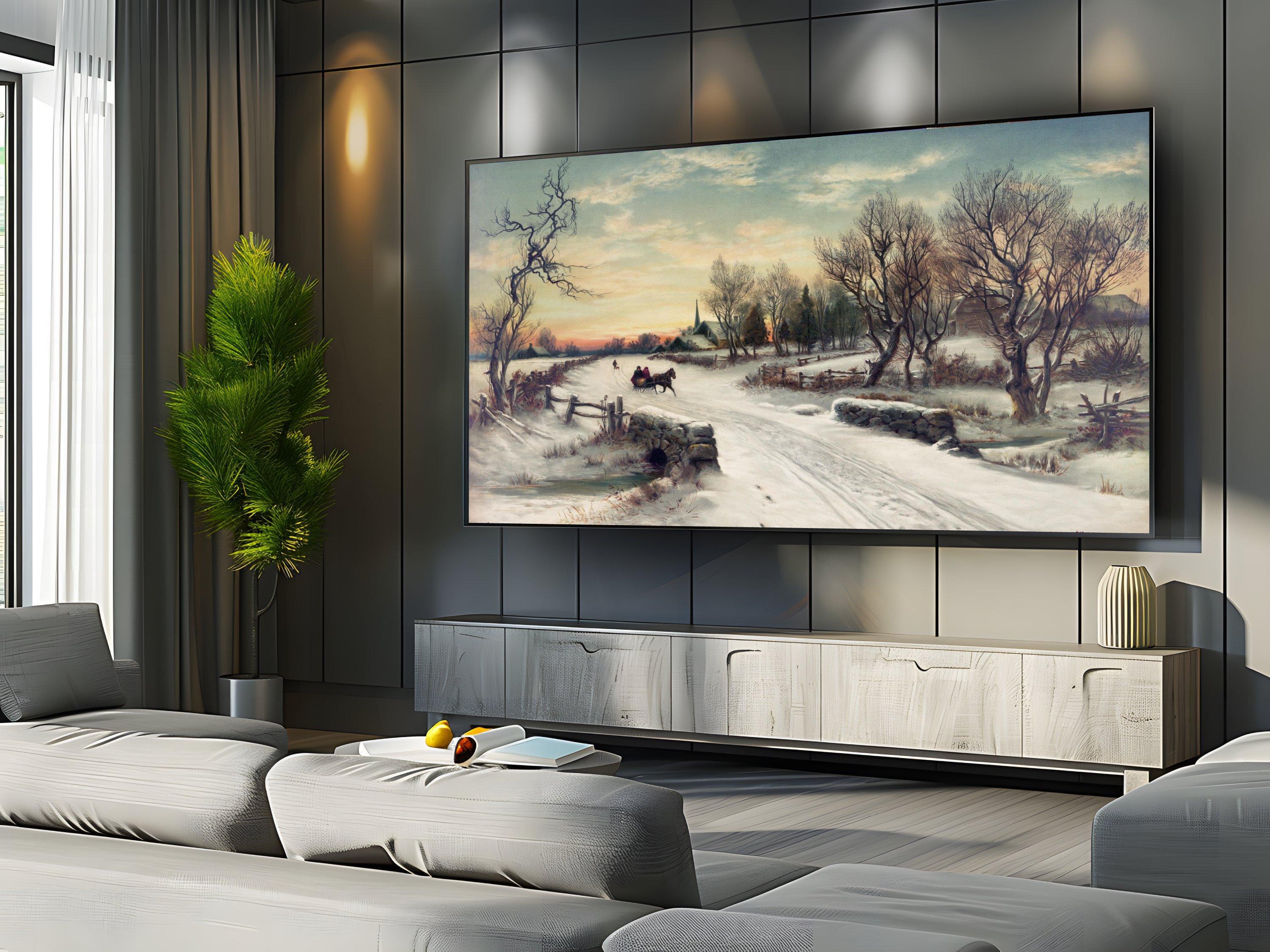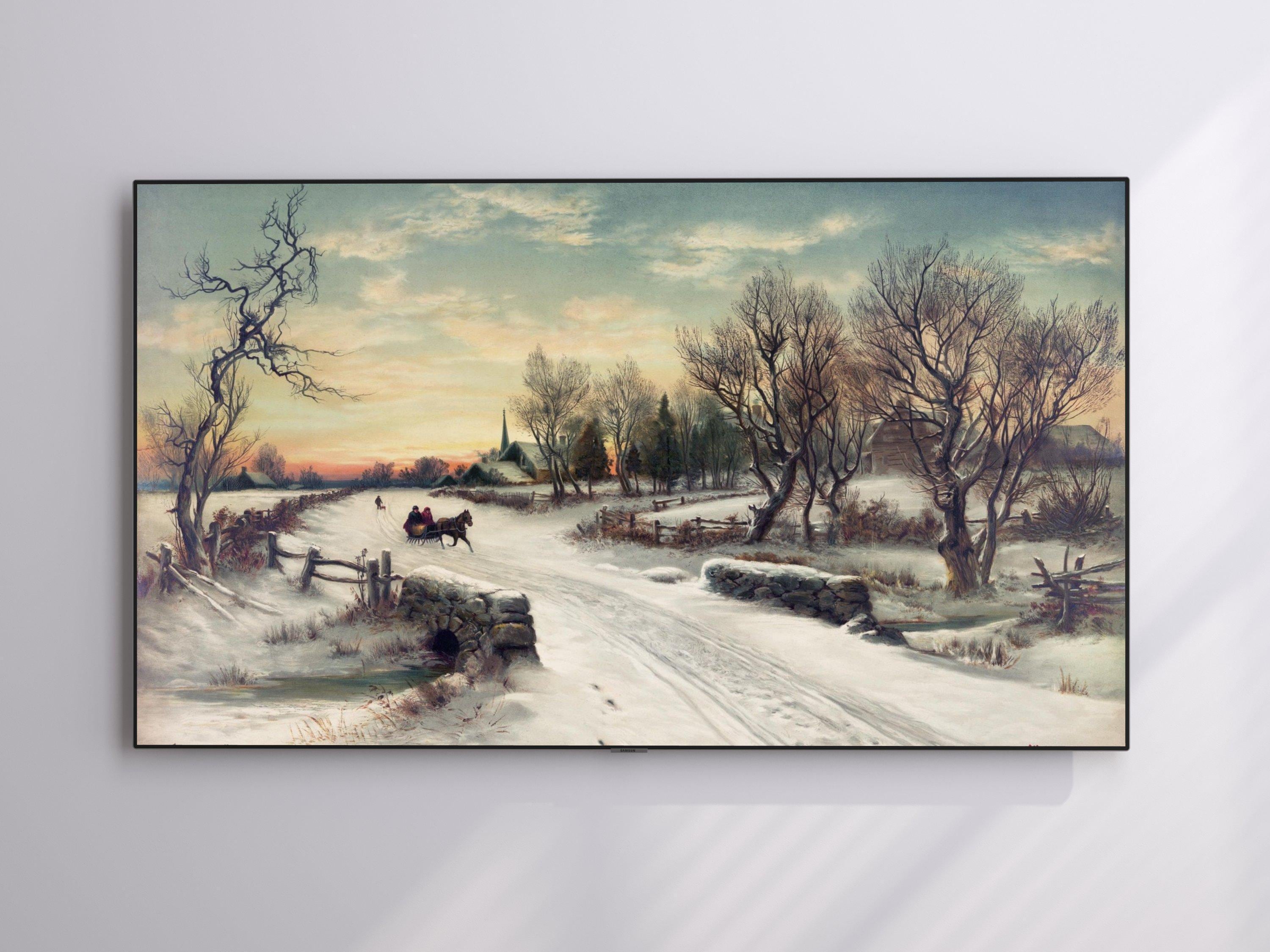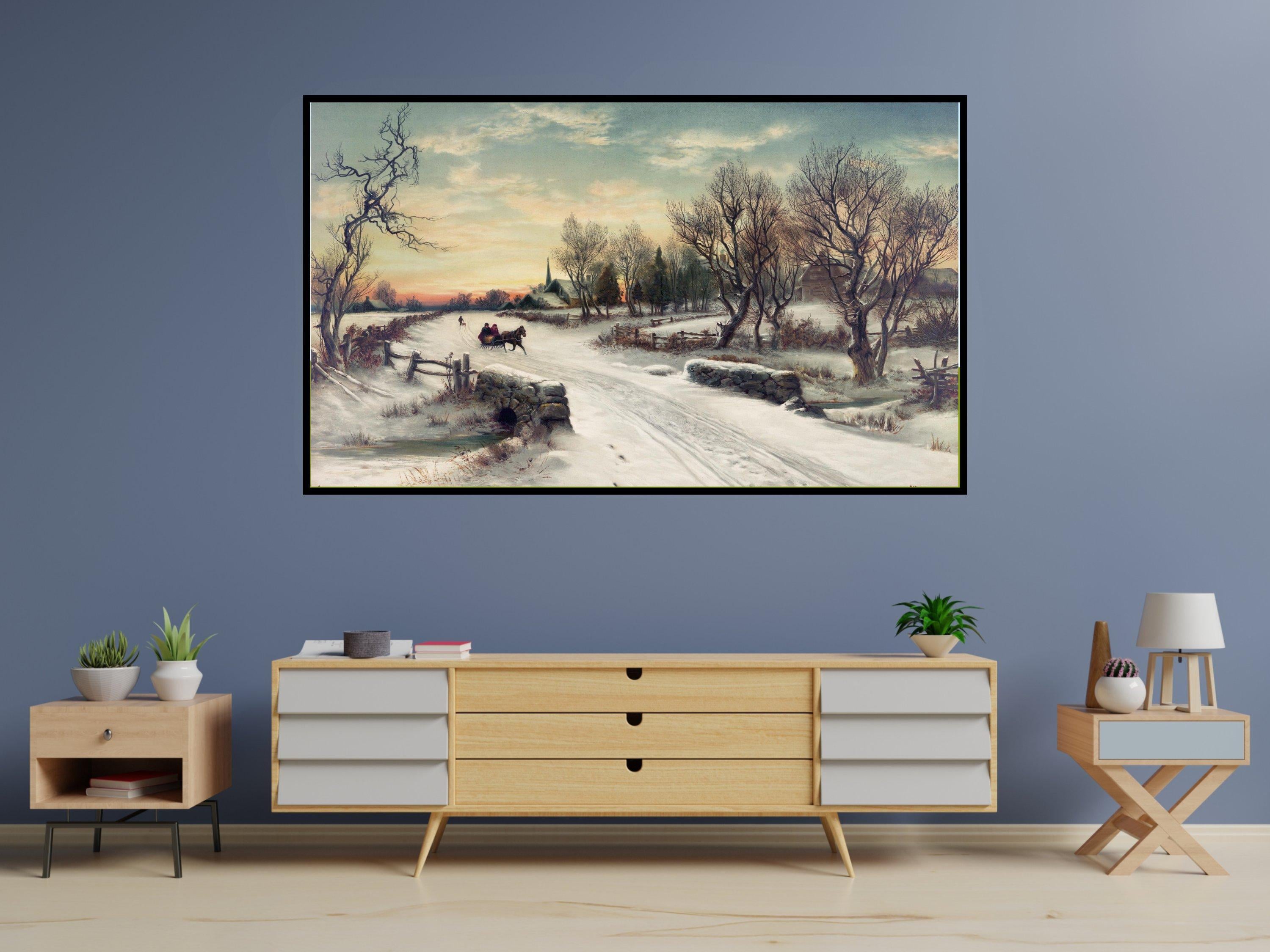 Immerse yourself in the serene beauty of a quiet winter day as a snow-covered road winds gently beneath leafless trees and wooden fences. This digital art download captures a pastel sky horizon that bathes the landscape in soft, warm hues, inviting calm and reflection. Perfect for peaceful home decor, it also features charming details like a distant church steeple view and a horseback rider along the tranquil path.