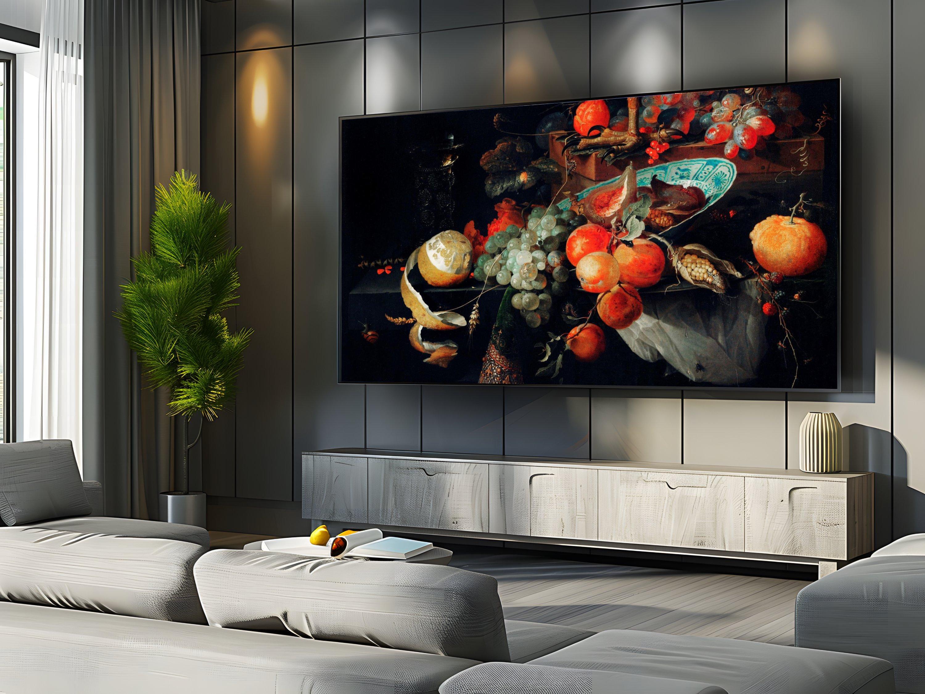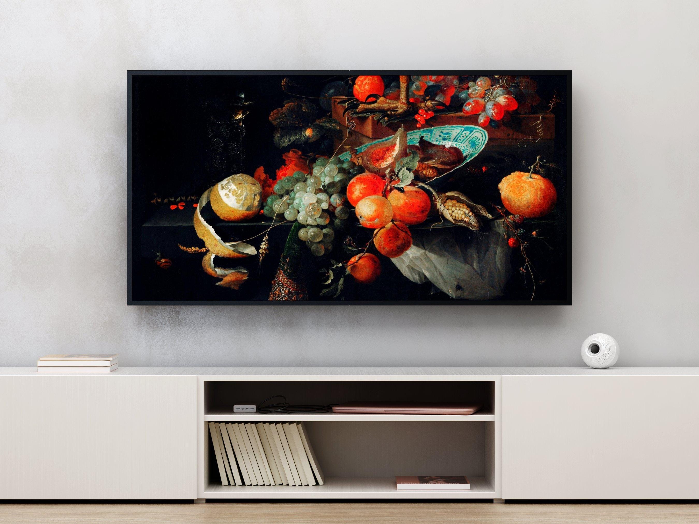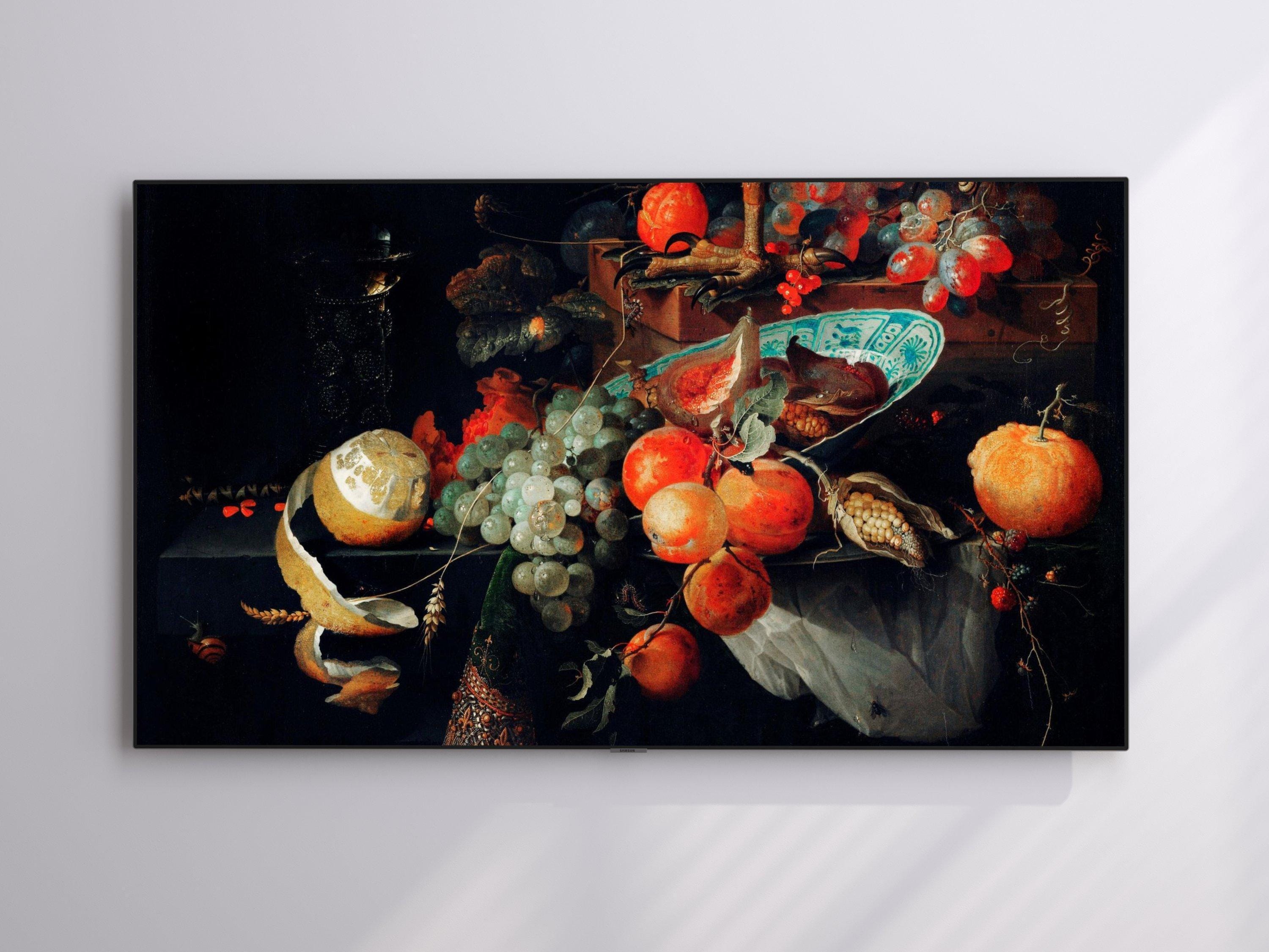 Step into a world where classic inspired art meets modern technology with this still life fruit digital screen designed specifically for Samsung Frame TVs. This 4K UHD screensaver beautifully captures a vibrant tableau of melon, orange, and grapes, enhanced by delicate blue white plate accents that evoke timeless elegance. Infused with lively insect details, this unique wall art gift brings a dynamic and fresh energy to any home decor digital collection.