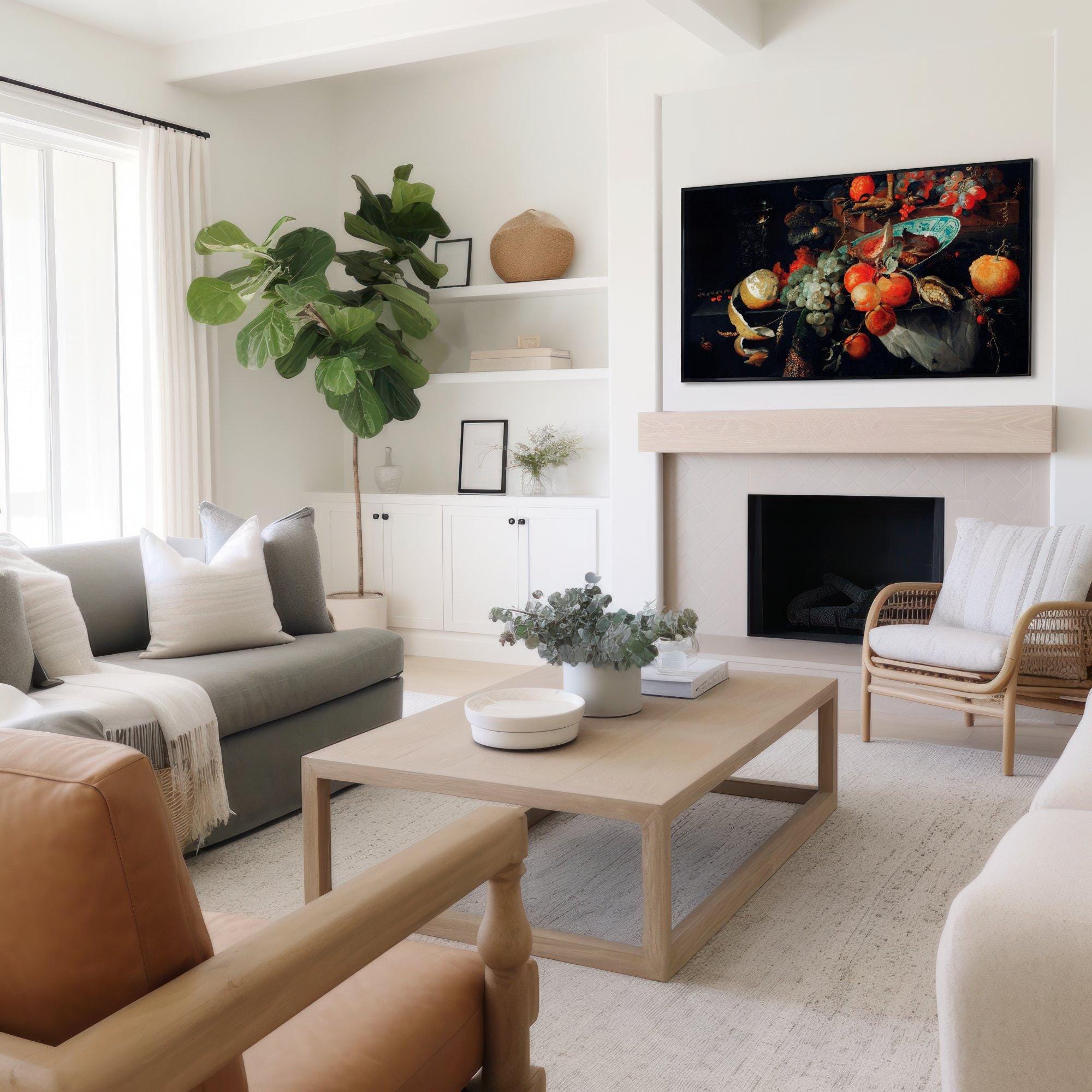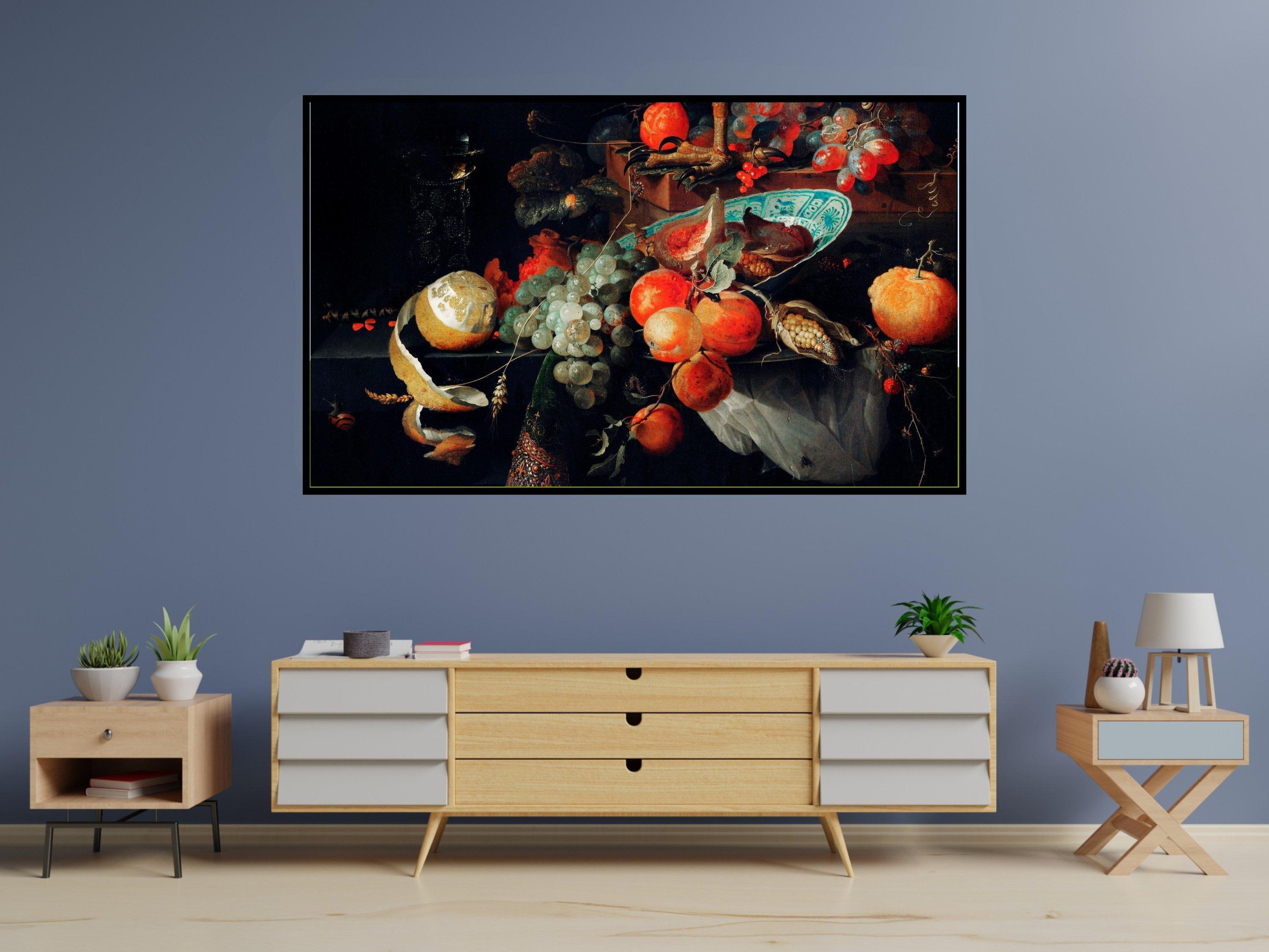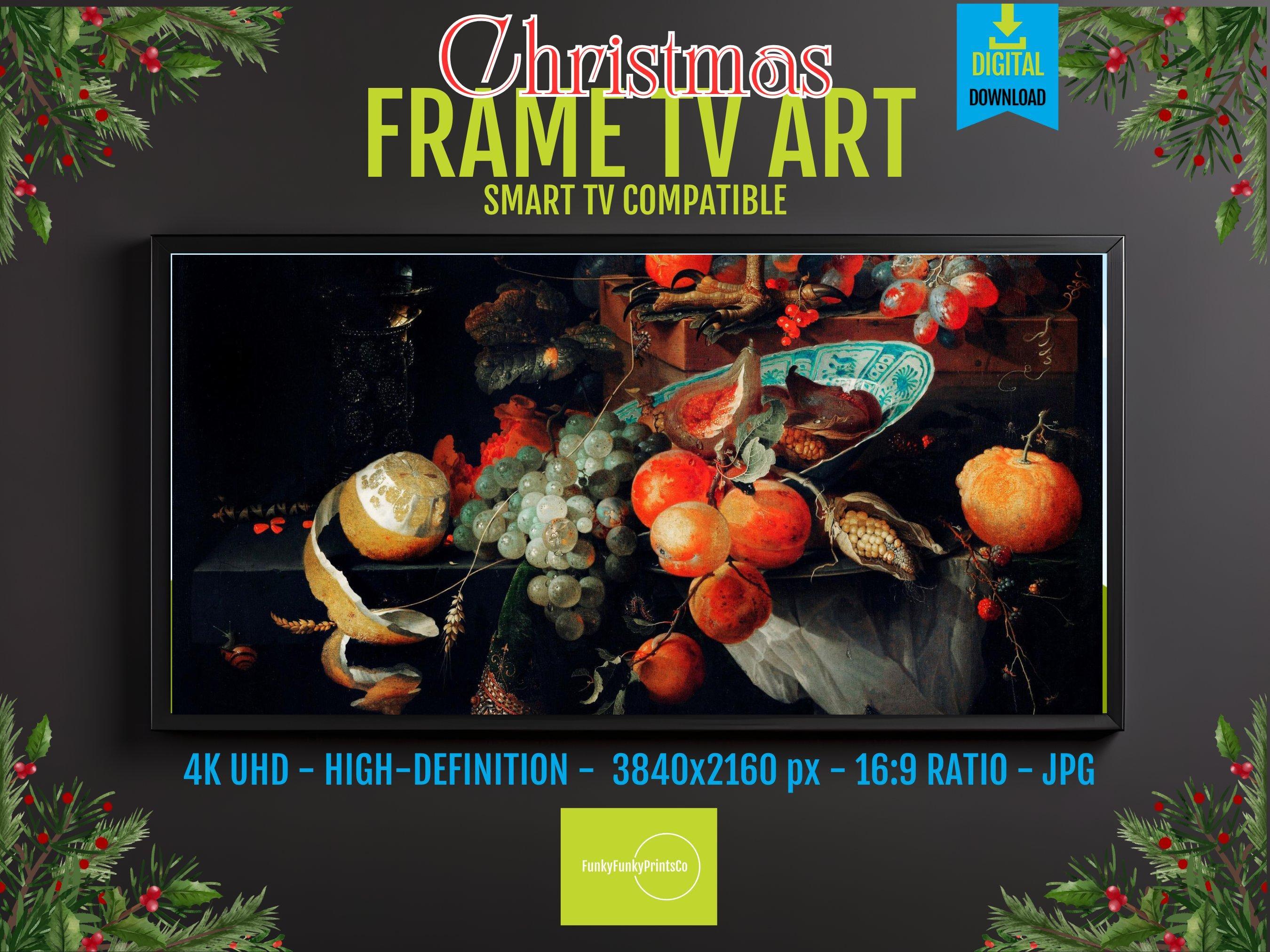 Step into a world where classic inspired art meets modern technology with this still life fruit digital screen designed specifically for Samsung Frame TVs. This 4K UHD screensaver beautifully captures a vibrant tableau of melon, orange, and grapes, enhanced by delicate blue white plate accents that evoke timeless elegance. Infused with lively insect details, this unique wall art gift brings a dynamic and fresh energy to any home decor digital collection.
