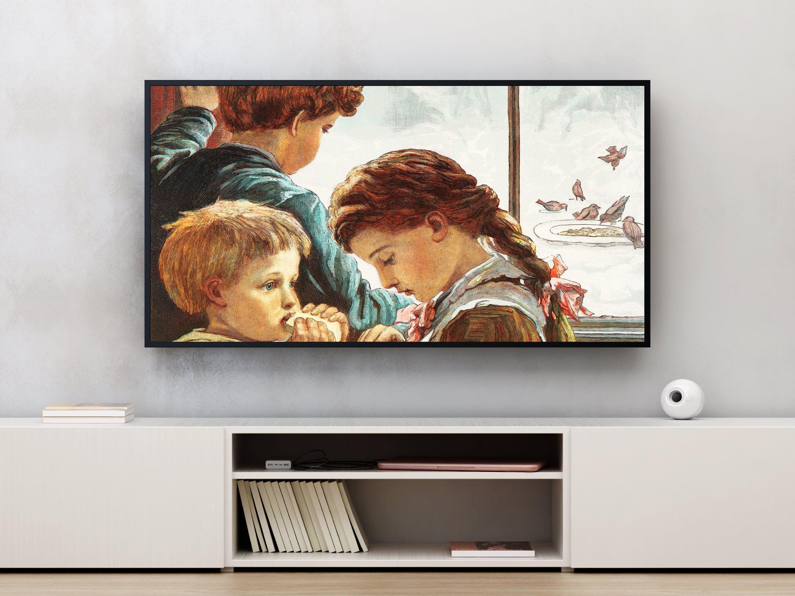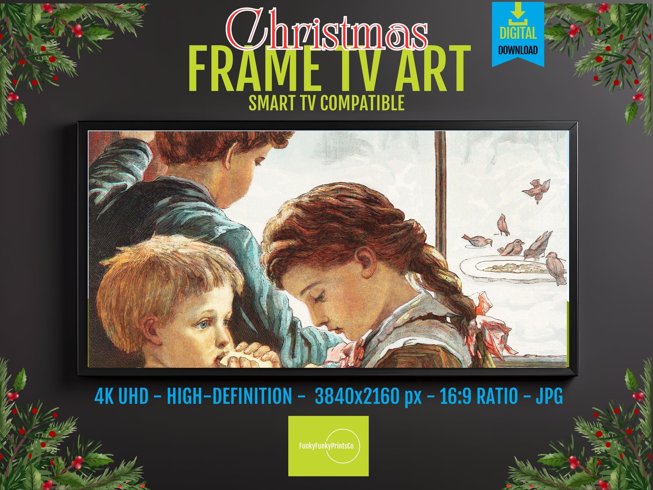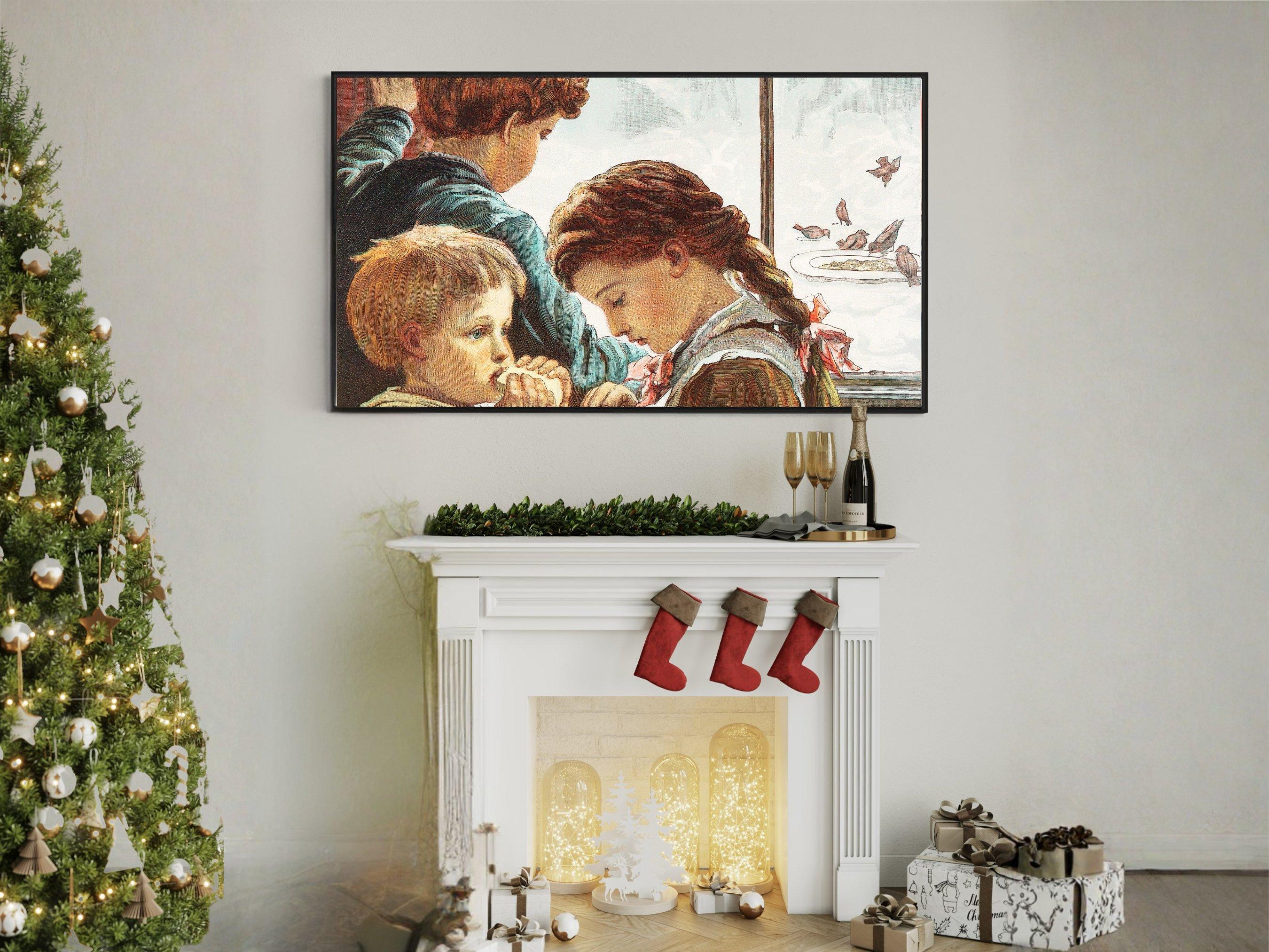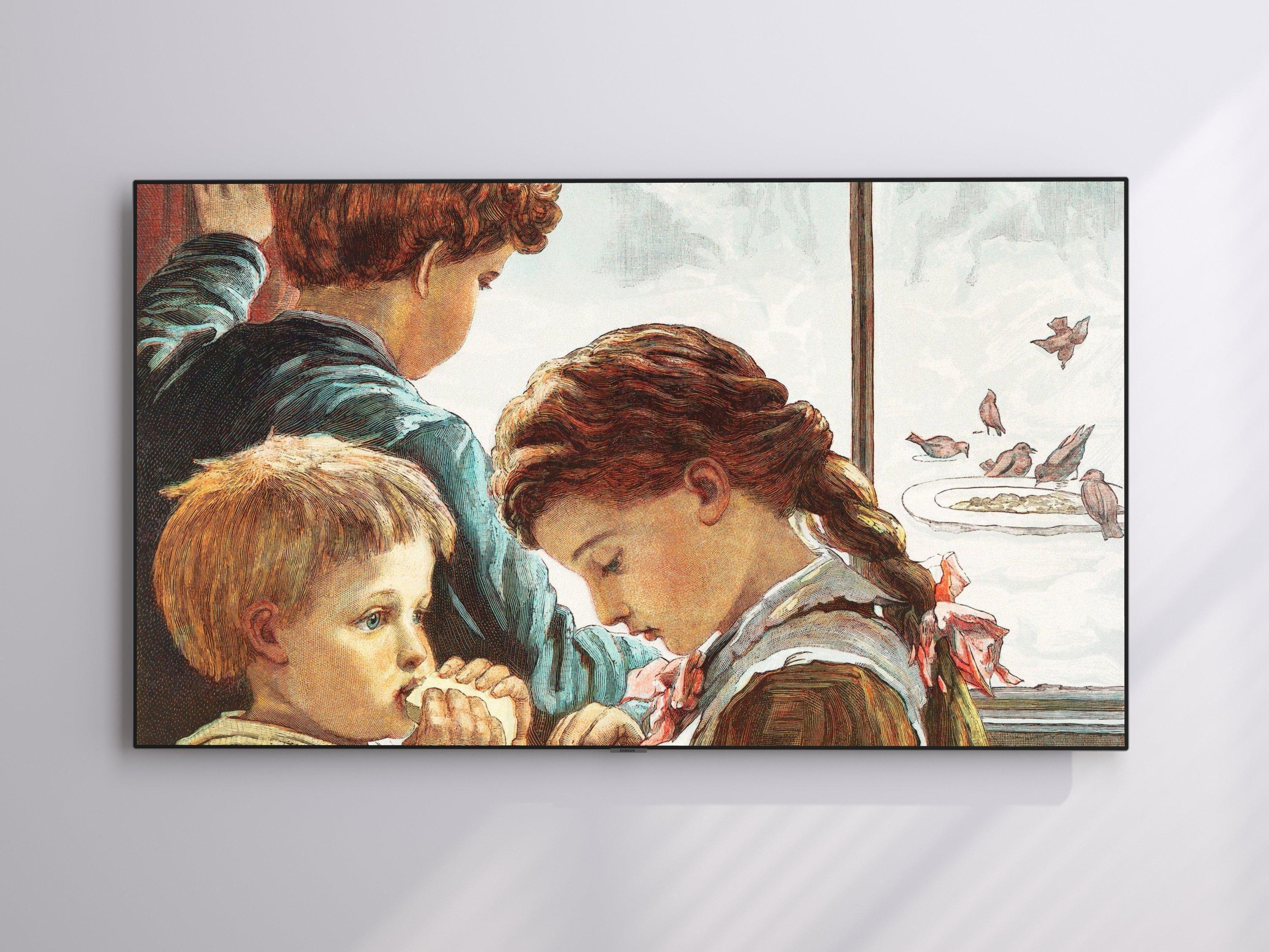 Immerse yourself in a cozy winter moment with this vintage winter scene, where children by snowy window capture the serene magic of the season. This 4K UHD digital art beautifully combines detailed line work and a warm nostalgic feel, inspired by early 20th-century illustrations that bring timeless charm to your digital space. Perfect for fans of nostalgic home decor, this piece invites you to relive cherished memories through art.