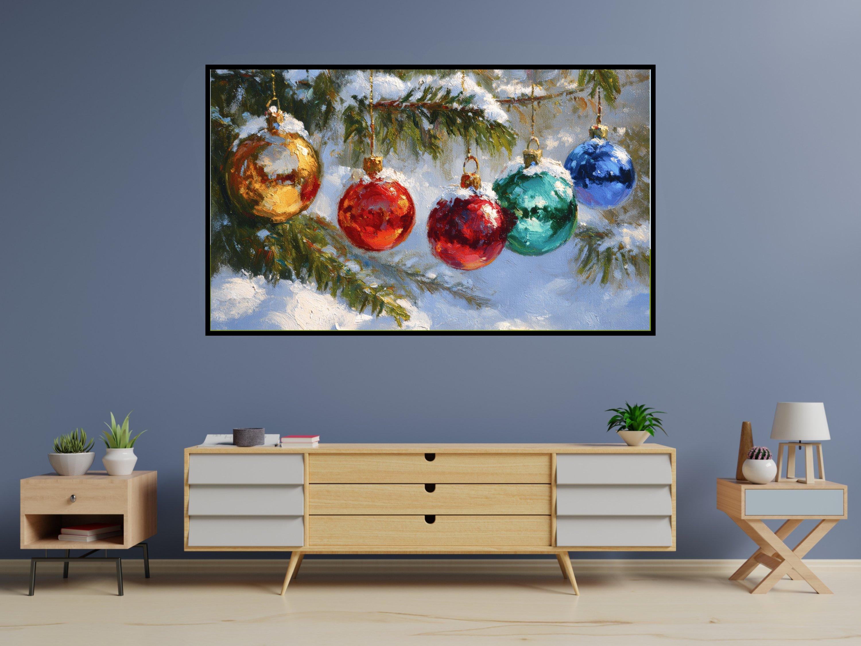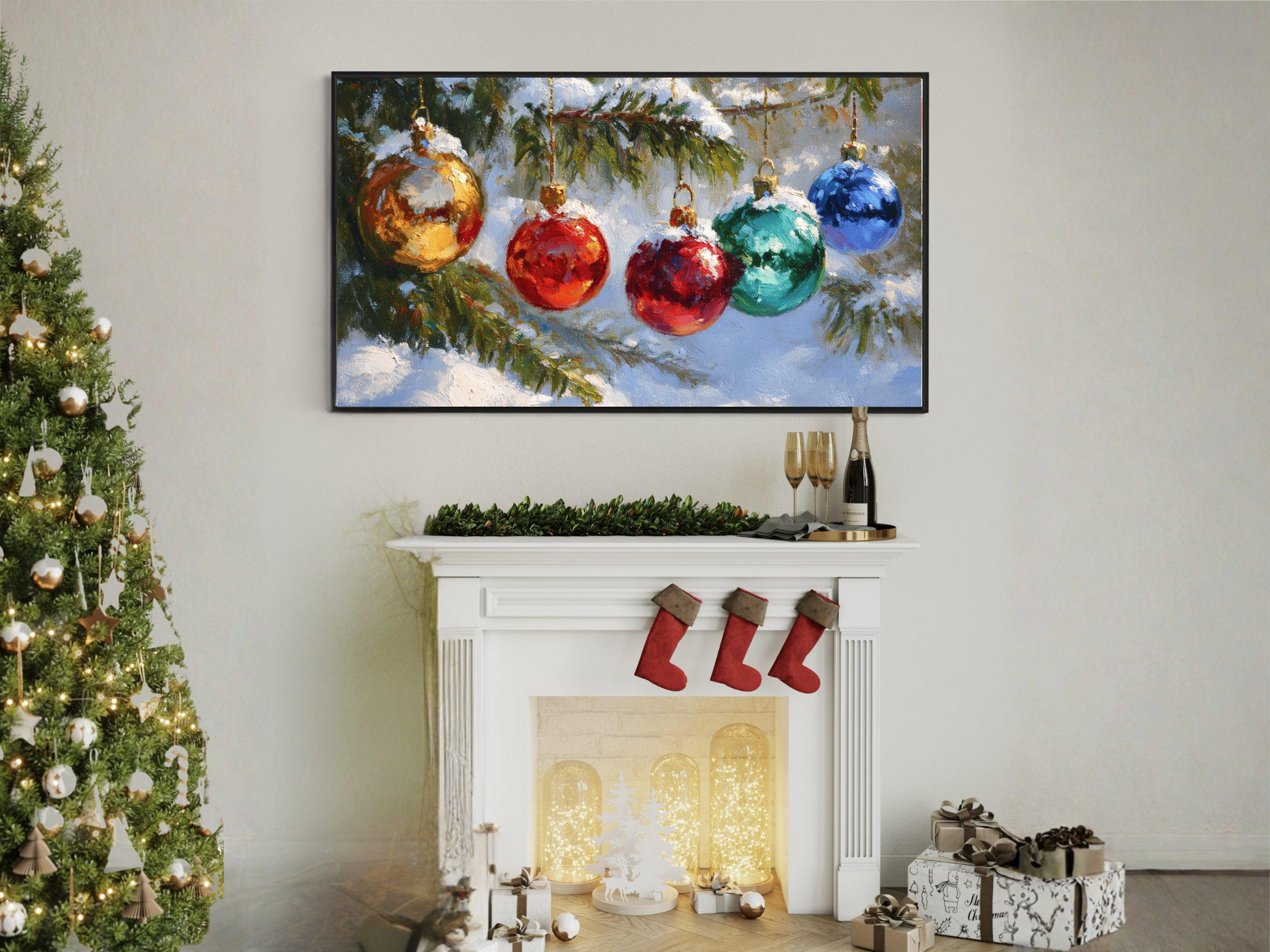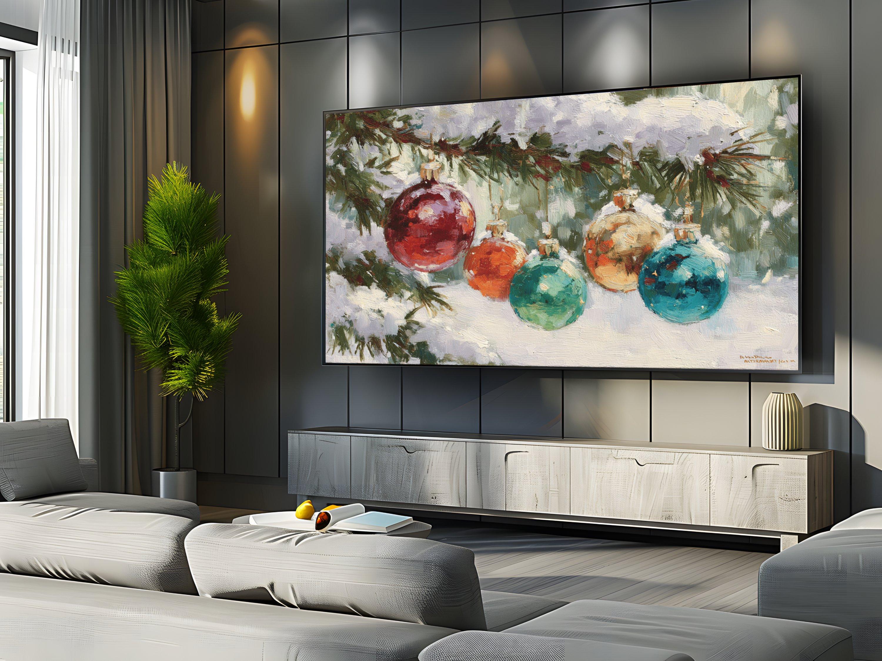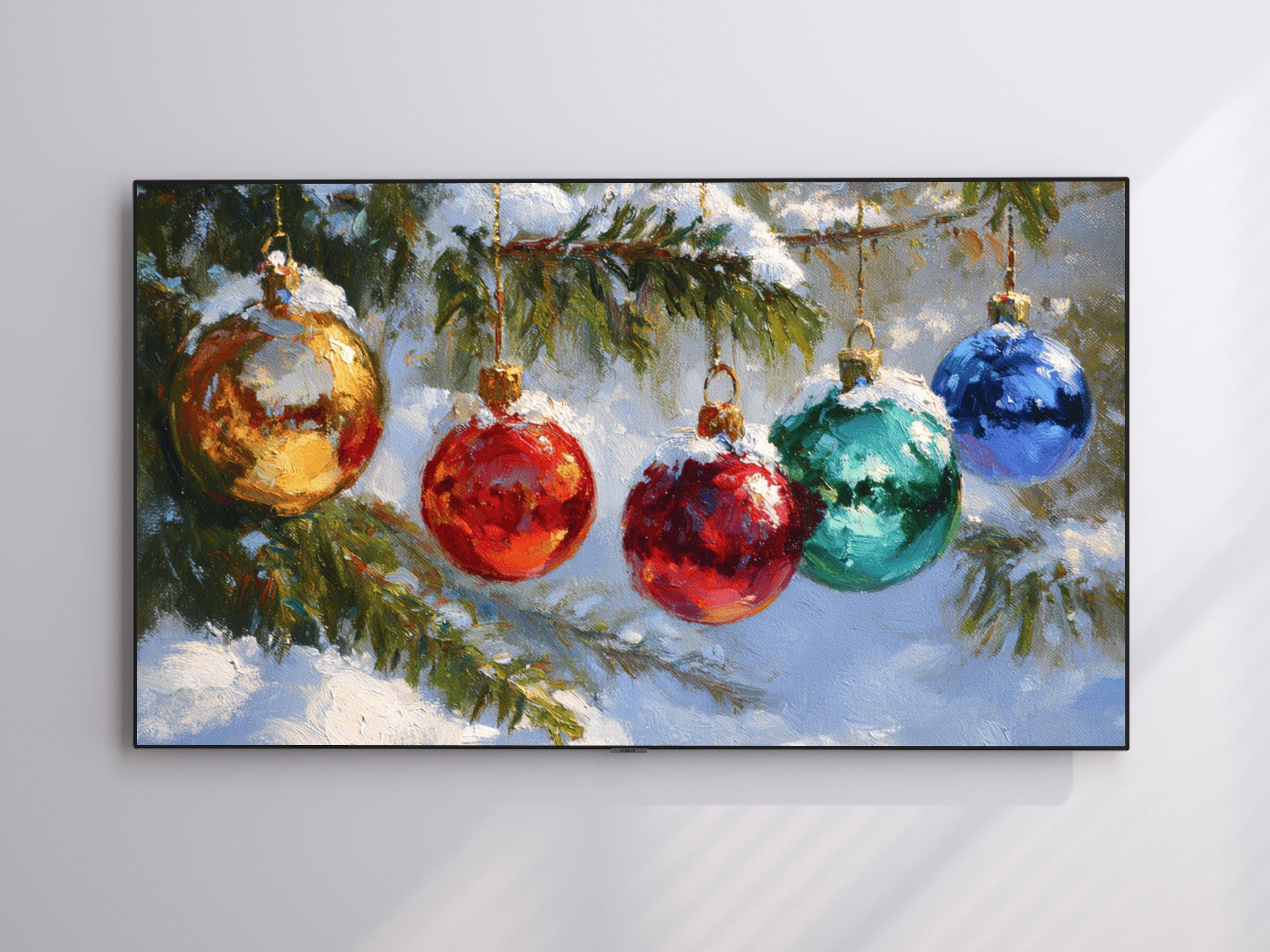 Step into a cozy winter scene where vibrant colors shimmer on delicate Christmas ornaments hanging from a snow-covered pine tree branch. This digital artwork captures the festive spirit with an impressionistic touch, perfect as a 4K UHD screensaver to bring holiday cheer to your Samsung Frame TV. Inspired by nature and the magic of the season, this instant download adds warmth and charm to your digital decor.