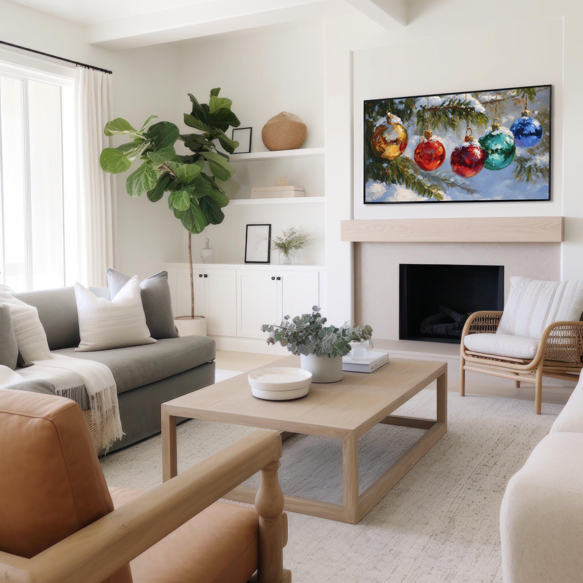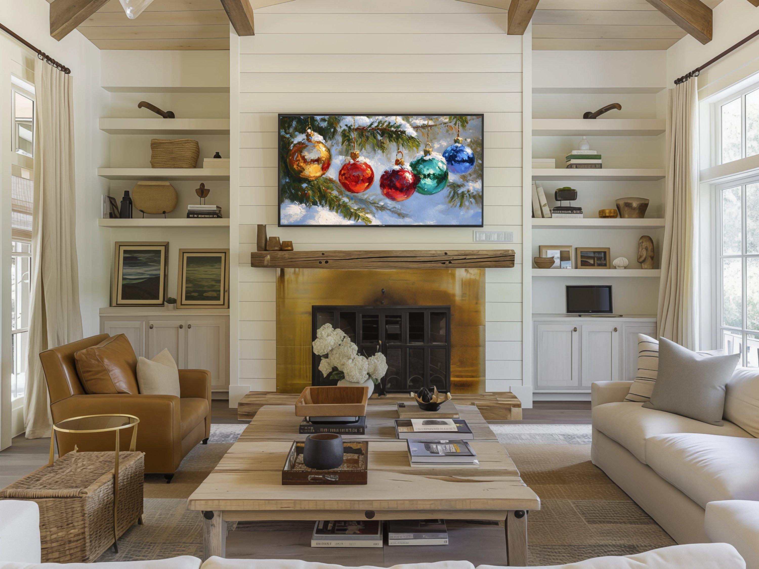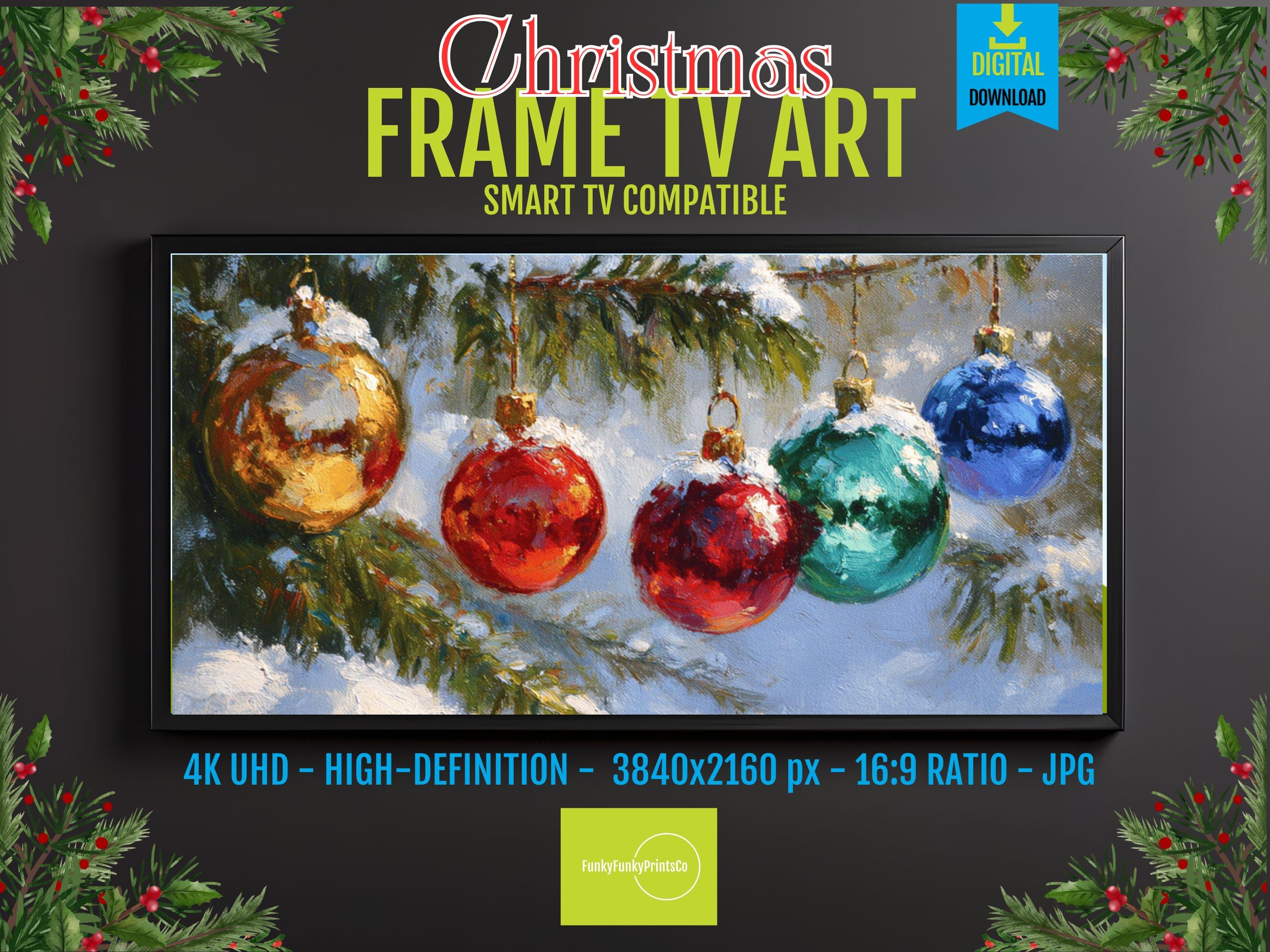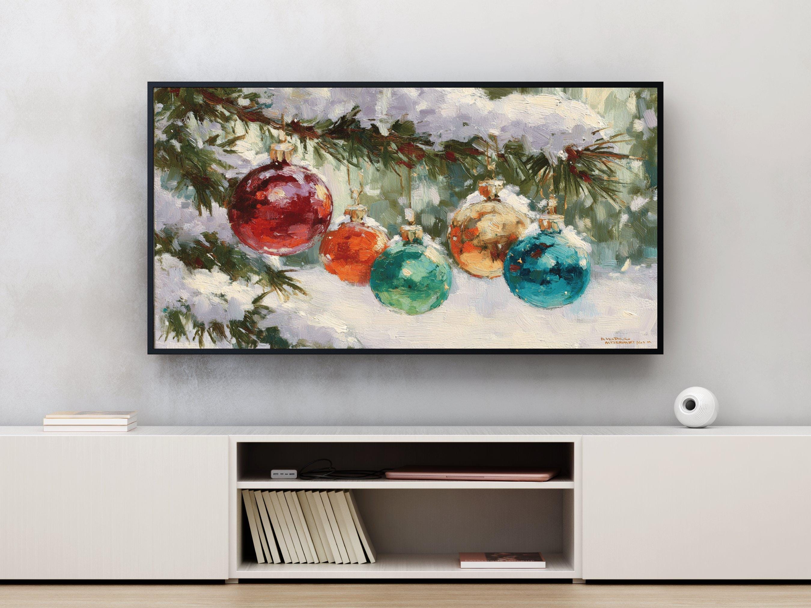 Step into a cozy winter scene where vibrant colors shimmer on delicate Christmas ornaments hanging from a snow-covered pine tree branch. This digital artwork captures the festive spirit with an impressionistic touch, perfect as a 4K UHD screensaver to bring holiday cheer to your Samsung Frame TV. Inspired by nature and the magic of the season, this instant download adds warmth and charm to your digital decor.